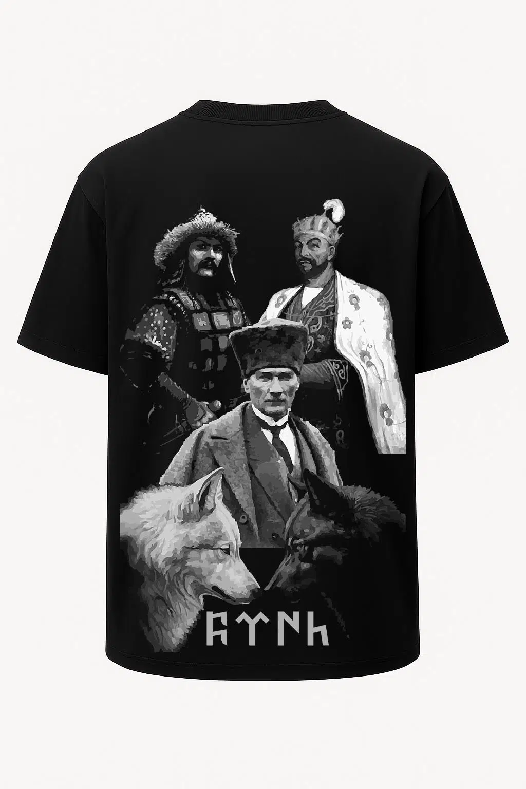 Türk Hükümdarlar Geniş Baskılı Oversize Tişört 55 cm uzunluğa sahip geniş bir tasarım alanına sahiptir. Tam boy baskı sevenler için özel olarak üretilen oversize tişört unisex tasarımda ve %100 organik pamuk kumaştan üretilmiştir. Geniş kesim yapısıyla, bol giyim tercih edenlere özel yapıdadır. Nefes alabilir kumaşı sayesinde sıcak günlerde bile konforlu bir deneyim yaşatır. Türk Tişörtleri yüksek dayanıklılığa sahip transfer baskı teknolojisi uygulanan baskılı tişörtlerimiz her yıkamada canlılığını korur. Atatürk, Metehan ve Timur görselleriyle bezenen, Göktürkçe Türk yazısının iki tarafında bulunan bozkurtlar ile Nirvoda'nın benzersiz ve eşsiz tasarımı ortaya çıkmıştır. Sadece Nirvoda'da bulabileceğiniz ürünü hem kendiniz için şık bir seçim, hem de sevdiklerinize özel ve anlamlı bir hediye alternatifi olarak tercih edebilirsiniz.